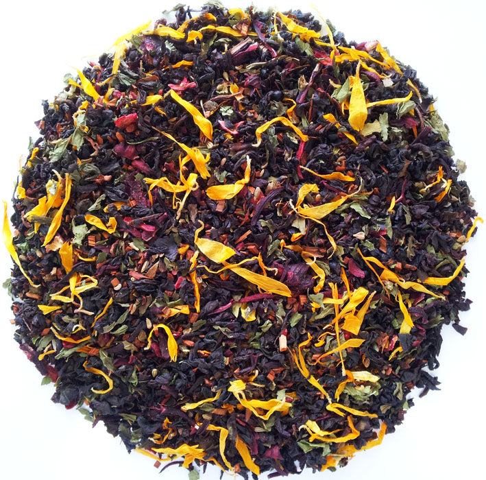 Adventurous blend of South African honey-bush, fruity hibiscus, mint, and spicy aniseed brewed in your cup and lingers with a sweet finish. Enjoy hot or iced.