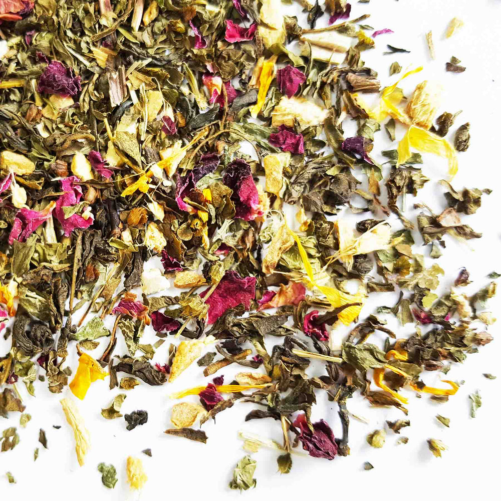 Green tea, ginger, spearmint, tulsi (holy basil), rose petals, echinacea, lemon balm, peppermint, calendula (all-organic ingredients)