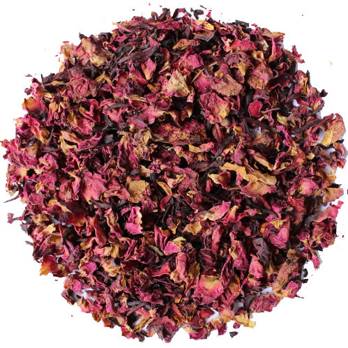 Hibiscus makes a tangy, refreshing, and ruby-coloured brew, widely consumed around the world, also known as karkady, Egyptian red tea, and Fleur de Jamaica. This blend combines the tangy hibiscus with sweet, red roses and is less tart than just hibiscus. The hibiscus flower is believed to naturally lower high blood pressure, the rose petals are high in vitamin C and together the herbs make a tasty, antioxidant-rich infusion. Great as iced tea.