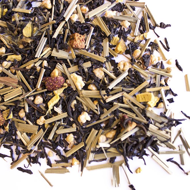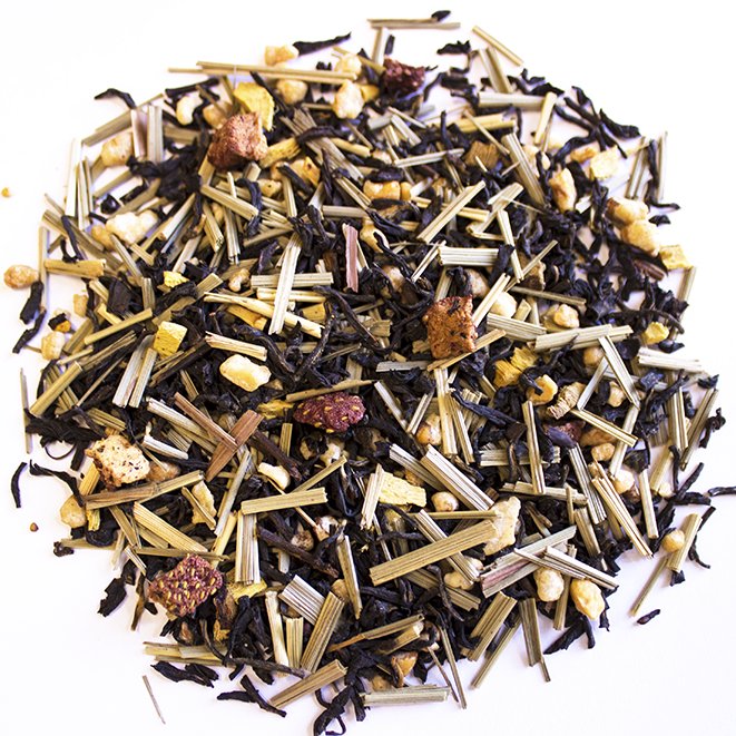 Black tea (Camellia sinensis) 50%, lemongrass, brittle pieces (sugar, hazelnut), liquorice root, freeze-dried blackberries, freeze-dried strawberry pieces, flavouring.