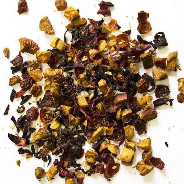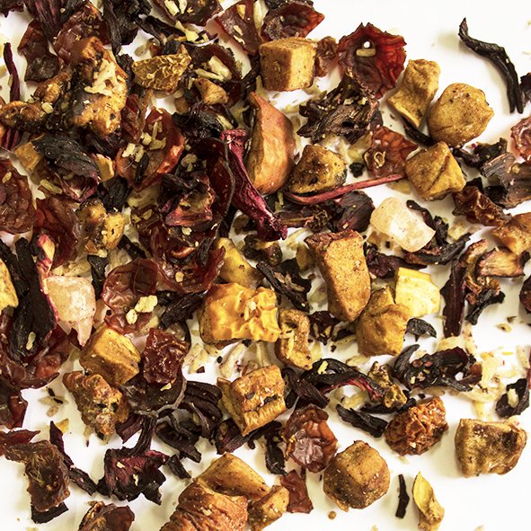 Apple pieces, rosehips, hibiscus, pineapple cubes, coconut, flavouring.