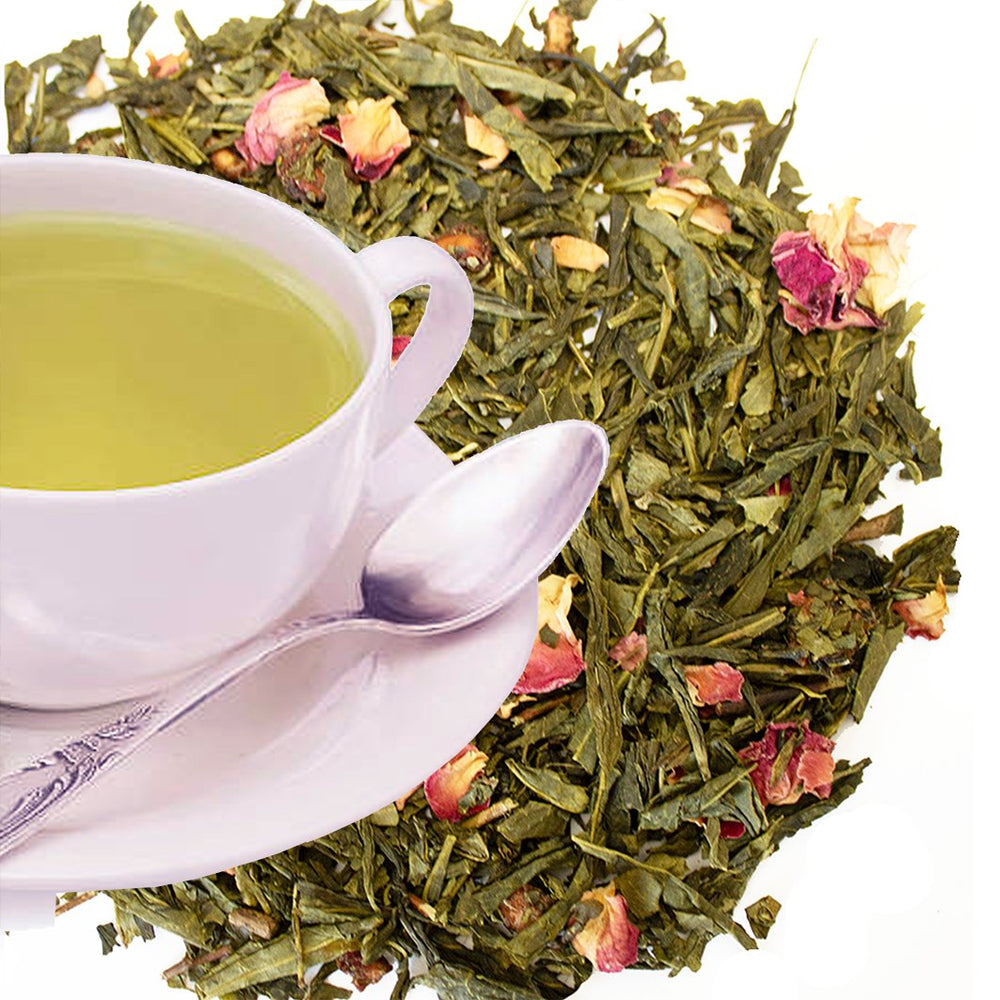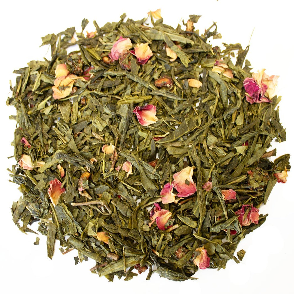 This exquisite green tea blend features a vibrant burst of freeze-dried pomegranate arils, delicately blended with fragrant, sweet rose petals. Enjoy the rich, invigorating infusion, whether steaming hot or chilled over ice.