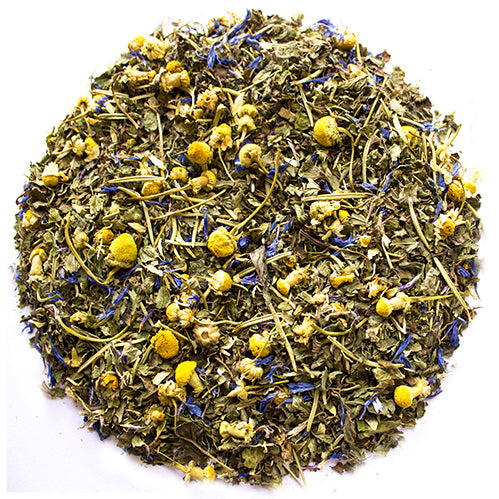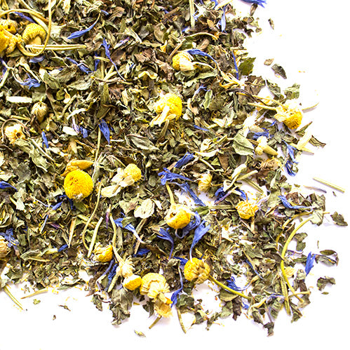 Chamomile*, peppermint*, lemon balm*, rosemary*, blue cornflower* (*all organic ingredients).