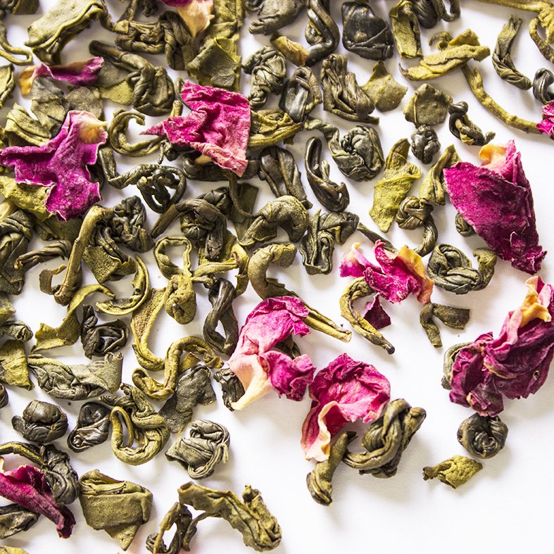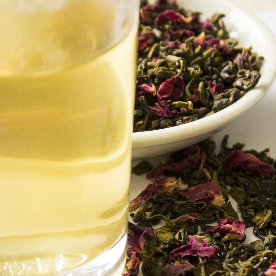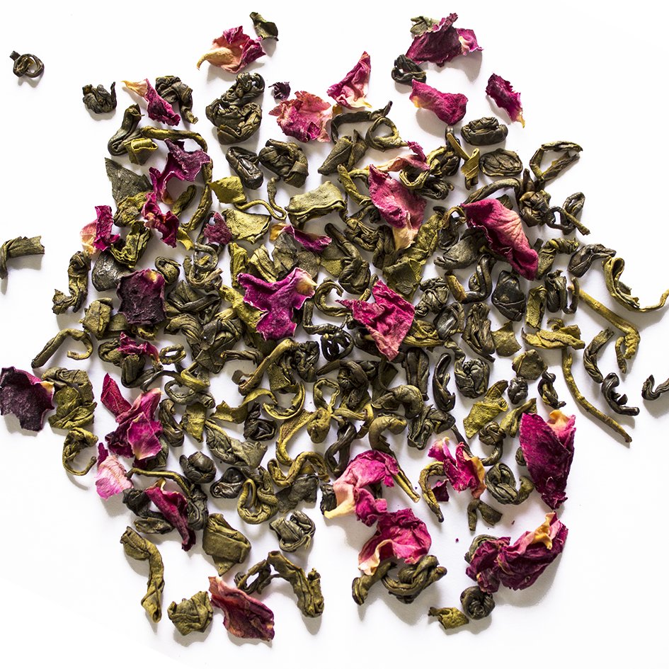 Green tea (Camellia sinensis), organic rose petals, natural rose flavour.