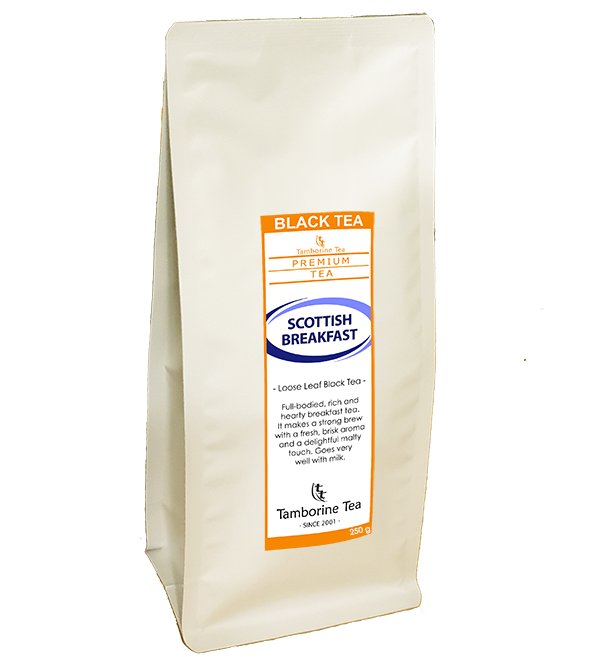 Scottish Breakfast is a fine leaf, full-bodied, rich and hearty breakfast tea. It makes a strong brew with a fresh, brisk aroma and a delightfully malty touch with a light astringent undertone. Goes very well with milk. Use 1 tsp. per cup, brew in hot water (99-100ºC) for 1-2 minutes if served without milk, 2-4 minutes if served with milk. If you want add extra strength to your milky tea, add some extra tea rather than extending the brewing time.