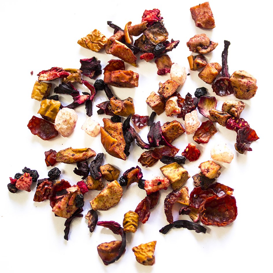 Apple pieces, strawberry pieces, hibiscus, elderberries, rosehip, pineapple pieces, flavour.