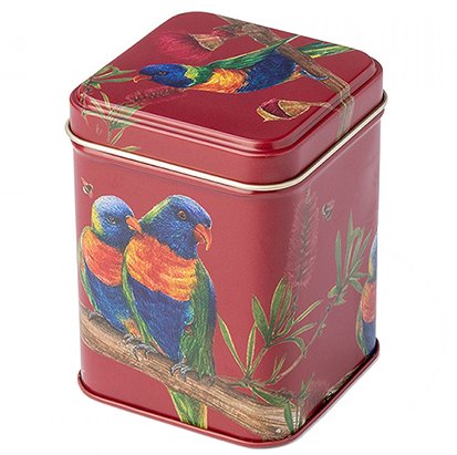Tea Caddy with printed desing, Rainbow Lorikeet on red.
